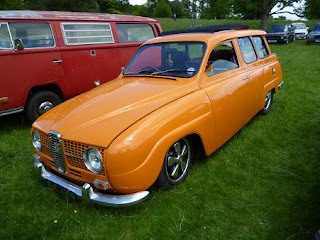 A Saab 96 estate, circa 1966 in bright orange and lowered with a V4 under the hood. |